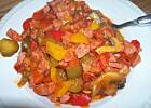 Następnie do papryki dodajemy podsmażone pieczarki, pokrojoną w kostkę mortadelę, koncentrat, ketchup oraz przyprawy. Dusimy pod przykryciem około 10-15 minut.