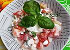 Umyte pomidory kroimy w drobniejsze kawałki, dodajemy pokrojoną drobno cebulę i bazylię.