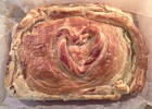 Całość przykrywamy drugim płatem ciasta francuskiego, naciskając lekko sklejamy brzegi ciasta i podwijamy robiąc dookola rulonik (po to by nic się ze środka nie wydostało).