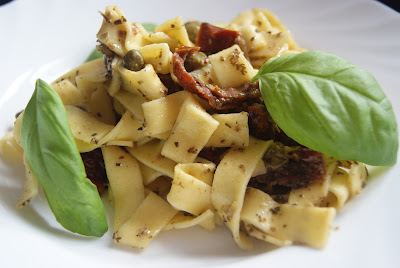 Makaron gotujemy al dente w lekko osolonej wodzie.Na patelnię wrzucamy pokrojone suszone pomidory,pokrojone oliwki i odsączone z wody kapary.Następnie dodajemy słoiczek ulubionego pesto i makaron.Mieszamy wszystko ze sobą.Posypujemy świeżo tartym parmezanem i dekorujemy bazylią.