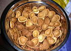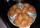 Ciasto należy dobrze wyrobić, patelnie do pieczenia orzechów posmarować margaryną lub polać troszkę olejem, następnie odrywać po kawałku ciasta i nakładać do foremek w patelni, piec na małym ogniu, przekręcając patelnie. gdy upieczemy już wszystkie skorupki orzechów należy oberznąć kawałki ciasta które wypłynęły z foremek.