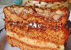 Jeden ostudzony placek posmarować przestudzonym budyniem.Przykryć drugim plackiem, posmarować masą krówkową i przykryć plackiem z orzechami. Lekko docisnąć.