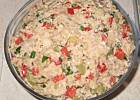Makrelę obrać z ości. Paprykę, ogórki, cebulę pokroić w kostkę. Ryż (zimny) i warzywa połączyć z rybą. Doprawić do smaku majonezem, keczupem, solą i pieprzem.