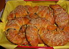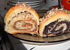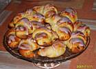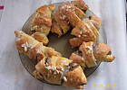 Rozsmarować nadzienie zostawiając mały margines na wszystkich bokach trójkąta - zwijać w rogaliki zaczynając od podstawy. Ułożyć na wyłożonej pergaminem blasze, przykryć i zostawić do wyrośnięcia, aż podwoją objętość około 1 1/2 godziny. Rozgrzać piekarnik do 180ºC. Wyrośnięte rogale posmarować jajkiem rozbełtanym z mlekiem i piec około 20 minut, aż się ładnie zezłocą. Wyjąć na druciana siateczkę i jeszcze ciepłe polać lukrem. Można posypać posiekanymi migdałami.