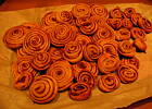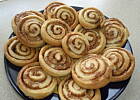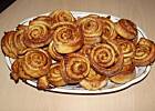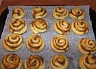 Z wyrośniętego ciasta upuszczamy powietrze, wyjmujemy na osypaną mąką stolnicę i rozwałkowujemy na mniej więcej kwadratowy placek grubości 0,5-1 cm. (Mam małą stolnicę, więc zrobiłam to w dwóch porcjach). Smarujemy ciasto równomiernie maślano-cukrzano-cynamonowym farszem - do samych brzegów. Następnie ostrożnie zwijamy w rulon. Po zwinięciu kroimy w kawałki grubości ok. 2 - 3 cm (zależy co kto lubi, ja lubię grubaśne). I układamy na blasze wyłożonej pergaminem do pieczenia - musimy zachować odstępy, bo rollsy nadal rosną.