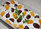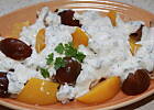 Śliwki wypestkować i rozpołowić. Brzoskwinie pokroić na duże cząstki. Na tacce lub dużym talerzu do podania, rozłożyć kurczaka, polać obficie sosem, poobkładać owocami. ( owoce nie powinny się ,,wybrudzić" sosem, by danie było efektowne ) Przybrać gałązkami natki.