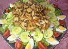 Brzegi płaskiej salaterki wyłożyć liśćmi karbowanej sałaty czerwonej, na niej ułożyć liście sałaty zielonej. Środek wypełnić podartą sałatą lodową lub cienko pokrojoną pekińską. Na liściach układać ćwiartki jajka i ćwiartki pomidora, poniżej plastry ogórka i plastry cebuli czerwonej