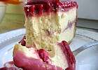 Teraz nakładać łyżeczką malinowy curd i delikatnie przemieszać, tworząc efekt marmurku. Ułożyć te odłożone maliny i zalać resztą masy serowej.