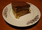 Przełożyć placki, zachowując kolejność: placek-krem-placek z orzechami-krem-placek. Ciasto polać ciemną polewą.
