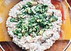 Równolegle do rondla wrzucić boczek pokrajany w większe kawałki, pokrajane cebulę i czosnek oraz chleb pokrajany w kostkę. Zalać niewielką ilością wody, gotować 10 minut i dodać szpinak. Gotować mieszając aż woda wyparuje i powstanie coś w rodzaju papki. Zajmie to tylko parę minut.