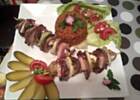 Wątróbki umyć i osuszyć papierowym ręcznikiem. Każdą przekroić na pół. Boczek pokroić w plastry o wielkości wątróbek. Pieczarki oczyścić, umyć i poprzekrawać na połówki. Cebulę obrać i pokroić w plastry. Na szpadki (lub patyki) nadziewać kolejno połówkę pieczarki, plasterek boczku, wtróbkę i plaster cebuli. Czynność tę powtarzać aż do wyczerpania się składników. Szaszłyki posmarować olejem i oprószyć pieprzem (nie solić !!!). Wstawić do nagrzanego do 180 stopni piekarnika. Piec 15 min (bardzo ważne, aby nie przekroczyć tego czasu). Gotowe szaszłyki przed podaniem posolić. Podawać na ciepło z ryżem czerwonym na ostro* i sezonowymi surówkami.
