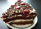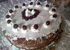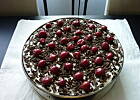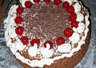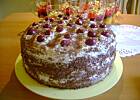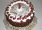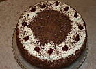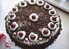 Biszkopt przeciąć na 3 krążki..... każdy krążek skropić ponczem, przekładać śmietaną i wiśniami..... boki i górę wyrównać śmietaną.... boki tortu obsypać pokruszonym biszkoptem.... Górę udekorować 12 różyczkami ze śmietany.... na każdej położyć wiśnię.... (ewentualnie na środku jedna różyczka z koską czekolady... jak na zdjęciu) ....na środek posypać startą czekoladę....