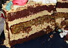 Jajka ubić z cukrem, dodać mąkę z proszkiem, kakao. Czekoladę rozpuścić w kąpieli wodnej i połączyć z masą jajeczną. Ciasto upiec w dwóch tortownicach lub w jednej i po całkowitym przestudzeniu podzielić na dwa placki. Całość pieczemy ok. 30 minut w temp. 170-180 stopni.