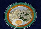 trzecia warstwa: wymieszać w miseczce: pokrojone drobno jajka, ser starty na tarce o dużych oczkach, posiekaną natkę i pozostałe składniki. Ułożyć na drugiej warstwie.