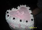 ciasto jasne przekładam dżemem, kłade drugie ciasto ciemne, między oba ciasta krem, ciasto ciemne krem + wiśnie na wierzch i boki pozostałość kremu ciniutko posmarowana. Rozwałkowuje mase cukrowa i pokrywam całe serce, na wierzch wycinam dwa serca formką do ciasteczek i kłąde je na siebie na to daję trzy kwiatki i po bokach tortu robię gdzieniegdzi dookołą rząd kwiatuszków, wokół tych kwiatuszków wyciskam kleksy ze śnieżki na cały tort oprócz wierzchu. Na wierzch wokół serca wyciskam ze śnieżki rozetki i na co drugą kłaę wisienke.gotowe i smacznego