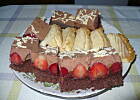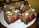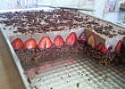 W kąpieli wodnej rozpuszczamy czekolady ze śmietaną. Po rozpuszczeniu wkładamy łyżkę tłuszczu i do lekko przestudzonej polewy wlewamy adwocat. W małej ilości wody rozpuszczamy żelatynę i dodajemy do masy czekoladowej. Lekko przestudzoną polewą smarujemy cały biszkopt. Następnie układamy ściśle przy sobie truskawki.