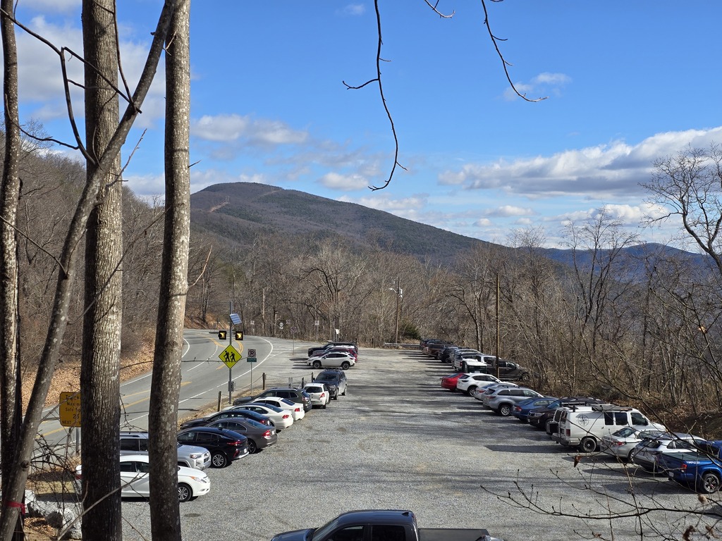 Ale po drodze, kilka minut przed parkingiem szlaku, zobaczyliśmy inny parking, zapełniony samochodami i kładka nad drogą dla pieszych. Pierwsze wrazenie, że to punkt widokowy.