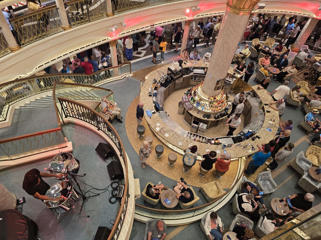 Tu jest tylko jedna rzecz na nie - atrium jest zajęte przez bar, tak jakby alkohol był w centrum, scena jest piętro czy dwa wyżej, na wysuniętym podeście, gdzie ewentualnie ludzie mogą ich zajść od tyłu, ewidentnie grają do kotleta, to jest do drinka.