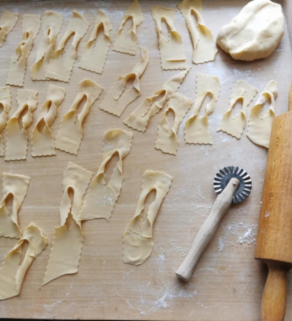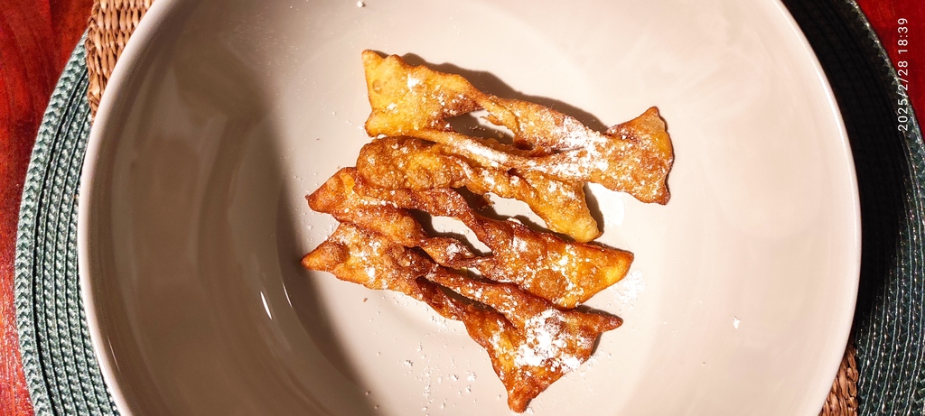 A chrust cięty w paski radełkiem, stąd falbanki po bokach, zabarwiony szafranem /daje kolor, lekko wytrawny smak a może nawet i 'wykwint