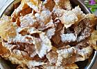 A chrust cięty w paski radełkiem, stąd falbanki po bokach, zabarwiony szafranem /daje kolor, lekko wytrawny smak a może nawet i 'wykwint