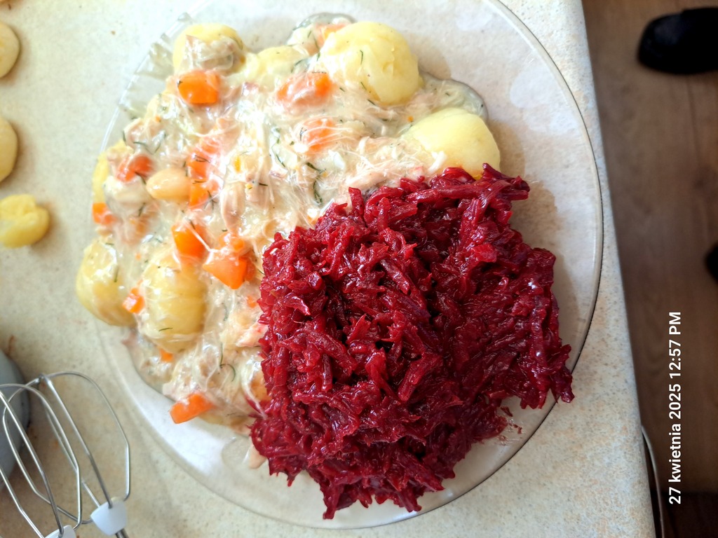 Witam, w środę jadę z mężem na majówkę do Giżycka i w domu zostaję syn i muszę coś mu ugotować na parę dni takiego żeby mógł odgrzać sobie w mikrofali, tylko pytanie co mu ugotować spaghetti na pewno ugotuję a co jeszcze prócz zupy, pozdrawiam Was serdecznie i życzę miłego, spokojnego i pięknego ciepłego dnia a to wczorajszy obiad,kluski śląskie potrawka z kurczaka, buraczki i lody