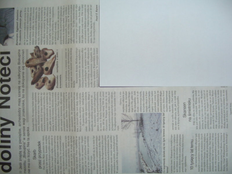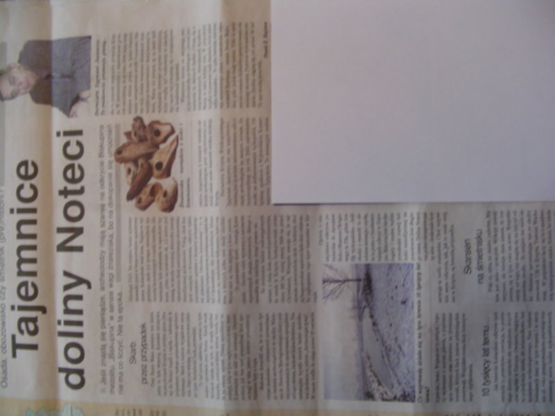 Może dobrze nie widać , ale jest to artykuł o odkryciu nad Notecią w okolicy Krzyża Wlkp "Biskupina" mezolitu."Biskupina" w sensie wagi znaleziska, bo na dokopanie się umocnień nie ma co liczyć. Nie ta epoka.Na podstawie badań radiowęglowych uznano z dużą dozą prawdopodobieństwa, że osada w Krzyżu funkcjonowała przez okres 100lat, mniej więcej 7600 lat przed Chrystusem.Wstępnie szacuje się, że zajmowała powierzchnię 1 ha, choć jej bezpośrednie zaplecze było dużo większe. To najbogatsze tego typu znalezisko w Europie. Wygrzebano wstępnie około 2.5 tys niewielkich wytworów krzemiennych z epoki mezolitu. Odnaleziono na głębokości 1.5 m obozowisko autentyczne mezolicznej społeczności.Odnaleziono narzędzia z poroża i kości jelenia. Zwykle takie wytwory z surowców organicznych ulegają zniszczeniu,dlatego z mezolitu dotąd nie byłoprawie nic. Dolina Noteci doskonale konserwuje w torfie znaleziska. Jak ruszą prace wykopaliskowe na wiosnę zrobię zdjęcia na miejscu. Teraz wszystko jest zabezpieczone i zasypane.
