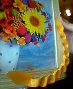 To jest taka tektóra, nigdy nie wyrzucam sztywnuch podełek po butach i innych takich bo się przydajądo takich właśnie celów. Na to przyklejam klejem do drewna (wikolem) wykałaczki, wycinam środek jak wyschną. I tak generalnie jak robięramki to przyklejam taką fosię przezroczystą, sztywną, taką na dokumenty. W tym przypadku nie przyklejałam wyjątkowo bo te kartki z kalendarza są sztywne i błyszczące(no to te obrazki przyleiłam do tektóry wiec z tyłu tektóra jest już zbyteczna). A ten element dekoracyjny to już jak kto woli. jan iczego nie wyrzucam, rózne ozdoby które są przy bukietach czy przy opakowaniu prezentów. No i zbieram różne "dary natury". A te elementy już kropelką przyklejam. Z tułu dodatkowo tektóry,tylko z jednego boku nie przyklejona żeby zdjęcie można było włożyć. jak do powieszenia to haczyk z drutu z tyłu przykleić a jak do postawienie to taka podstawka, też wycinami ją z tektóry. Ja ją albo przyklejam klejem albo zanim tektórę z tyłu przykleję to podstawkę zszywaczem do niej przytwierdzam.