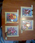 Oto ramki na ścianę z wykałaczek szaszłykowych. Wszystkie są takie same, tylko motyw dekoracyjny jest w każdej inny. Natomiast w środku jest motyw kwiatowy(wedle życzenia mamy bo to ona chciała czegoś na ścianę)