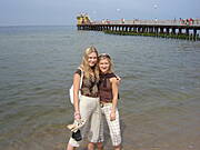 A to my obie na tle morza i mola (jednego z dwóch tam) w Ustroniu Morskim