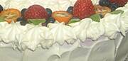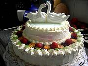 | Tort weselny PREMIERA Glumandy | Mozna zrobic wiecej tych skrzydel i szyji, bo to kruchy material, po upieczeniu .. Suszyc w piekarniku, 3-4 godziny w temp. nie wiecej niz 50°C ... tak dlugo aby nie bylo w srodku miekkie. Krem na pokrycie calego tortu: Rowniez byl od Dr. Oetker, krem do tortow, przygotowany z miekkim maslem + mlekiem wg. recepty na opakowaniu. Mozecie uzyc swojego, wyprobowanego kremu maslanego czy innego, o ktorym wiecie, ze jest pewny i sie nie rozplynie... a wycisniete dekoracje beda sie dlugo trzymaly. | Uwaga! tort jest pracochlonny i wymaga duzo cierpliwosci ale efekt jest extra! ![]() Czekoladowy biszkopt ulozyc na odpowiednio duzym talerzu do tortow. Nasaczyc go przygotowanym ponczem z alkoholem lub bez..jak kto chce. Przygotowac jasny i ciemy krem (ja uzylam waniliowego i czekoladowego). Na biszkopt nalozyc metalowa obrecz, ew. brzeg tortownicy. Ciemny i jasny krem nakladac naprzemian lyzka, w srodek biszkoptu, w ten sposob krem uzyska wyglad w paski. ( to jest opcjonalnie, tak sobe wymyslilam). Na to nalozyc biszkopt karmelowy. Nasaczyc go rowniez, nastepnie tort wlozyc do lodowki. Po 2 godzinach, przygotowac krem jogurtowo-owocowy wg http://wielkiezarcie.com/przepis16663.html wylozyc krem na gore karamelowego biszkoptu. Caly czas pozostawiajac tort z obrecza, czy tez brzegiem tortownicy. Ponownie wlozyc tort do lodowki na 2 godziny lub na noc a reszte zrobic na drugi dzien. Maly biszkopt, przekrojony uprzednio - jedna czesc polozyc na srodku masy jogurtowej - oczywiscie po calej nocy dobrze stezalej. Nasaczyc ponczem. Przygotowac krem jogurtowy malinowy z polowy porcji, przepisu powyzej (patrz link) Na maly biszkopt zalozyc obrecz lub brzeg z malej tortownicy. Wylozyc gotowy krem. Na to polozyc druga czesc biszkoptu. Calosc umiescic w lodowce. Uwaga potrzebujemy duzo miejsca w lodowce, zwracamy uwage, aby zadne kielbasy czy inne silne pachnace pozywienie nie lezalo w lodowce, bez opakowania... W ostatecznym wypadku mozna wyciagnac jedna polke z lodowki, zeby bylo dosc miejsca. Po dobrym schlodzeniu tortu, wykanczamy go caly na bialo, kremem waniliowym czy smietankowym... jak kto chce. Szerokim nozem smarujemy najpierw najwyzsze pietro, to co wychodzi po za brzegi smarujemy na bok tortu, schodzac tym smamy na dolne pietro tortu. Tak samo postepujemy z dolny czescia. ![]() Brzeg dekorujemy malutkimi rozetkami. Dolna czesc udekorowalam owocami, z ktorych byl zrobiony krem jogurtowy. Listki miety czy tez melisy utworza optymalna calosc. Skrzydelka labedzi sklejamy dopiero teraz lyzeczka bitej smietany odlozonej, przy przygotowaniu kremu jogurtowego. Pomiedzy skrzydelka wkladamy szyje. Ja namalowalam na szjkach oczy i dzioby ... cienkim pedzelkiem, uzylam do tego sok z jagod na oczy a sok z malin na dzioby. |