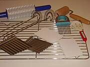 - wałek przeznaczony do mięsa (jego użycie zastępuje brutalne ubijanie mięsa i przerywanie włókien), używam go także do nadawania ozdobnej faktury przy pieczeniu ciasta kruchego lub ciasteczek - wychodzi dość fajna kratka, dalej ulubione sprężynki bez których rzeczywiście nie umiałabym się obejść - dzięki nim żaden budyń, gotowany krem się nie przypali jeśli będziemy delikatnie mieszać po dnie garnka, można nimi także ubić pianę np. do naleśników, dalej trzymak do cebuli, jarzyn, łopatka do wybierania kremów (ulubiona), metalowe ustrojstwa do krojenia warzyw i nie tylko w ozdobne ząbki, karbowane plastry i wreszcie plastikowa łopatka i "grzebień" do dekoracji brzegów tortów, ciast i czego tylko chcemy...:)))