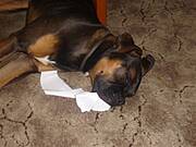 skarpetki,chusteczki chigieniczne,cebule,chrzan,czosnek,buty dosłownie wszystko.W nocy tylko słyszałam jak nieraz piszczał z bulu.Teraz już się uspokoił,jeszcze gryzie buty i szmaty.Ale to kochany psiak.