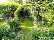 Jeśli chodzi o powojnik to też miałam jeden /ten wlaśnie różowy - kwiaty w realu ma piękne i tak okazałe, że wyglądają jak sztuczne/ i nawet wiedziałam jaka to odmiana, ale teraz już nie pamiętam. Kiedy chciałam kupić drugi i posadzić z drugiej strony, szukałam o podobnych kwiatach, ale wyszły....ciemny fiolet, prawie granatowe, kwiatki małe i kwitnie znacznie później.............dlatego na drabince wygląda, że kwitnie jedna strona tylko...