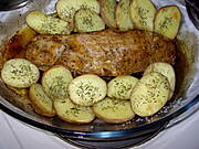Poledwice oczyszczona marynuje okolo 2 godziny, kartofle male nie obrane gotuje 10 minut w gotujacej sie wodzie, odcedzam, kroje na polowki. W piekarniku 200 C rumienie poledwice po kazdej stronie, obracajac, zmniejszam piekarnik na 180C, dookola poledwicy wkladam ziemniaki, smaruje odrobina oleju, doprawiam sola, pieprzem i tymianem. Pieke w piekarniku okolo 20 minut, do miekkosci ziemniakow. Podaje z masa zielonej salaty i surowkami. Poledwice kroi sie na porcje bezposrednio w naczyniu. Smacznego!