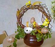 Wczoraj włąśnie tez zrobiłam, wykorzystałam najprostsze materiały- bazie, gałązki wierzby mandżurskiej, dokładnie umyte i osuszone skorupki jajek, piórka. Kupiłam w sklepie ogrodniczym bluszczyk, bukszpan w doniczce i przepiękne zawilce. Oraz kilka osłonek.