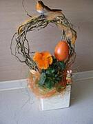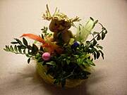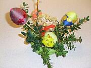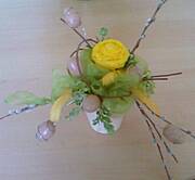 doniczkę włożyłam do osłonki, z kawałków wierzby mandżurskiej i witek bazi uplotłam wianuszek, którym załoniłam brzeg osłonki, do ziemi wbiłam zólte piórka, kawałek organzowej szarfy zrobił zielony "ogon"; bardzo plastycznym aluminiowym drutem, oplotłam plastikowe jajka i powbijałam do ziemi.