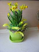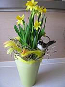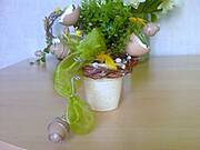 Zawilec- sadzonkę ( 3 zł) włożyłam do osłonki, miejsca, gdzie było widac ziemię zasłoniłam pętelkami z zielonej organzy, dodałam żółte piórka gałązki bazi ( na krzyż wbijane na drucie prosto w ziemię), oraz jajka plastikowe oplecione aluminiowym drutem.