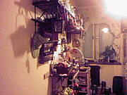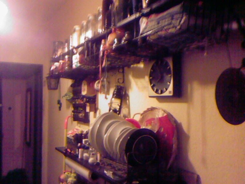 Najpierw stał tam tylko czajnik- teraz jest zagracona do granic możliwości. Potem okazało się, ze druga pólka- wysoko- równiez się przyda, a potem to już pełna improwizacja- koszyczki z Ikea dokupiliśmy, różne relingi, koszyki na warzywa i owoce- które wiszą sobie na kutych podpórkach.