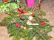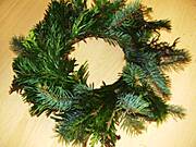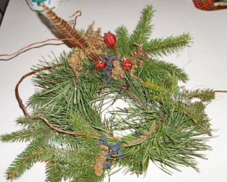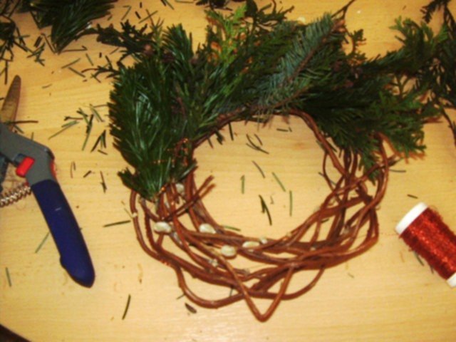 Jesli chcesz koniecznie zrobić na bazie wianuszka- to zrób tak: Zaopatrz się w jakiś grubszy drut, albo witki giętkich gałązek, albo słomiany ( wilkinowy) gotowy wianek; pocięte gałązki iglaków ( swierk lepiej nie- bo bardzo szybko opada, no i ręce bedziesz mieć mocno pokłute. Najładniej wyglądają rózne gatunki iglaków- sosna, jodła, tuja, może byc też jemioła); dość mocna nitkę.