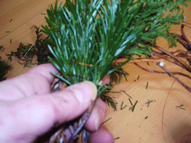 1. najprostszy sposób - to kupic gotowy słomiany podkład koszt w zaleznosci od wielkosci to 2-.. 45 zl ale średnio za średnice 30 cm placisz 4 złote wiec koszt nieduzy. Świerk, jodłę lub inny iglak tniesz na fragmenty 5-10cm tak aby uzyskac jak najwiecej, tniesz w przeciwnym kierunku niz rosna igly, pamietaj iz mozesz ciac w rozgalezieniach