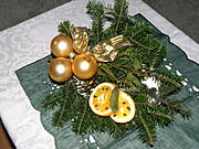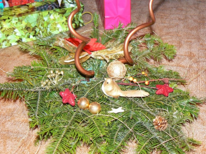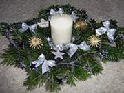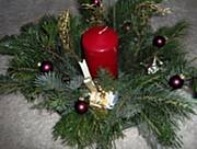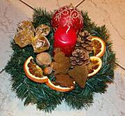 Możesz postawić świecę na talerzu dekoracyjnym, albo na paterze; obok połozyć gałązkę jakiegoś iglaka ( a jeszcze lepiej związać drucikiem pojedyncze gałązki różnych iglaczków)- skośnie i dołozyc do tego z dwie bombki.