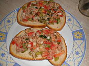Na przyklad: ciemny chleb podgrzany jak tost, smarowidlo: ser philadelphia, pokrojone w cienkie paski suszone pomidory, liscie rucoli a na wierzch plaster swiezej pomaranczy.