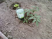 A jeśli chodzi o pomidory ,to miałam takie duże butelki po wodzie i oleju 5litrowe poprzecinałam je na pół,odciełam dno i górę i do ziemi,w to pomidory.Na niektóre mi zbrakło to porobiłam dołki dookoła