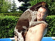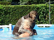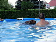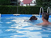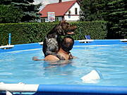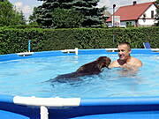 No nareszcie nowe zdjęcia :)) Super pływak z Kaktusa i jakby co to pan- ratownik pod bokiem :) Mój Negro byłby zachwycony takim basenem i miałby go pewnie tylko dla siebie i nie pozwoliłby raczej nikomu do niego wejść, a jeśli już komuś by się to udało to zaraz by go ratował ;) W zeszłym roku pojechalismy go wykąpać nad rzekę i musiałm poprosić pana z wnuczkiem żeby poczekali z kąpielą bo nasz ratownik od razu leciał do dziecka i chciał go na siłę wyciągać z wody, chociaż chłopaczek stał w niej tylko po kostki. Na szczęście dziadek był wyrozumiały i dam się psu wykąpać ;)