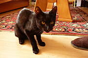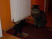 Był głodny i zmarznięty, ale strasznie przytulaśny i mruczący. Tym podbił nasze serca i już został (bo jak nakarmić i wyrzucić kota, gdy na dworze -16?). Bylismy już u weterynarza - ocenił jego wiek na 4-5 miesięcy. Jest już odrobaczony, a jutro jedziemy na szczepienie. Nie wiedzieliśmy jak zareaguje na niego Majek, ale o dziwo koty zaprzyjaźniły się i szaleją po domu:
