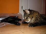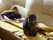 Dziś trochę smutno - jakieś fatum od paru dni nad nami ciąży. W czwartek Majek został potrącony przez "terenówkę" - ma połamaną szczękę, na jedno oko nie widzi, nie wiadomo czy da się uratować drugie. Przed nim co najmniej 2 operacje. Większość czasu spędzamy u weterynarza. Na dodatek Mały wczoraj został też potrącony przez samochód, ale niestety nie przeżył. Poniżej ostatnie zdjęcia moich kotów - jeszcze zdrowych:
