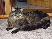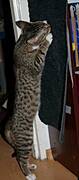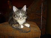 Maurycy ma w sobie bradzo dużo ze żbika - sylwetka - mimo sporej wagi nadal jest długi i chudy. Aby stworzył puchatą kulkę - musi porządnie sie zwinąć. Centki na grzbiecie, pręga i czarny koniuszek ogona...Musiała się jakaś babka mocno zapatrzeć...Do tego pociągły trójkątny pyszczek