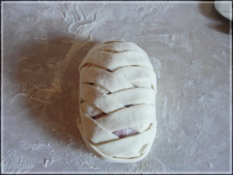 A te mumie robicie tak,że macie pod spodem całe ciasto,a po bokach rozcięte,dajecie farsz i zaplatacie po bokach,tak?