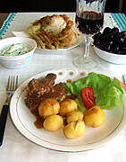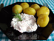 Mlode ziemniaki z koperkiem i cebulka oraz zsiadle mleko. Dla miesozercow gulasz wiperzowy z papryka i papryka konserwowa. Na deser czeresnie