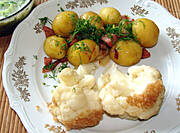 Młode ziemniaki z koperkiem, paluszki rybne, kalafior z bułką tartą i może gotowana kapusta tak samo podana.